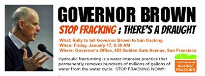 Event: BREAKING: Gov. Brown announcing drought emergency in San Francisco Friday. Rally to tell him to ban fracking.