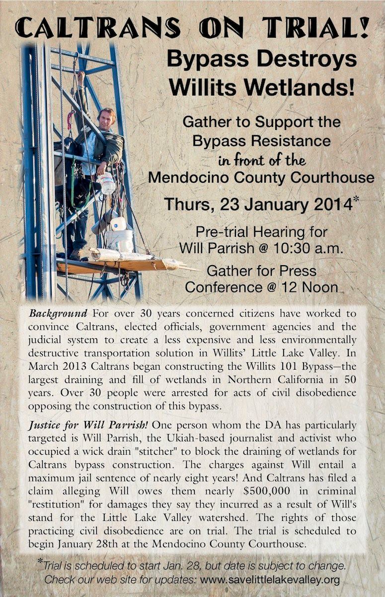 For over 30 years, people in and near Willits have worked to convince Caltrans, elected officials, government agencies, and the judicial system to create transportation infrastructure in Willits' Little Lake Valley that minimizes destruction and cost. In March 2013, Caltrans began constructing the Willits 101 Bypass -- the largest draining and fill of wetlands in Northern California in 50 years. Over 30 people have been arrested for acts of civil resistance opposing the Bypass' construction.