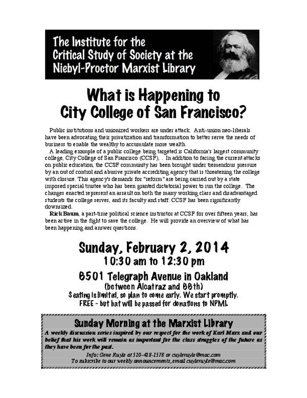 Rick Baum, a part-time political science instructor at CCSF for over fifteen years, has been active in the fight to save the college. He will provide an overview of what has been happening and answer questions.