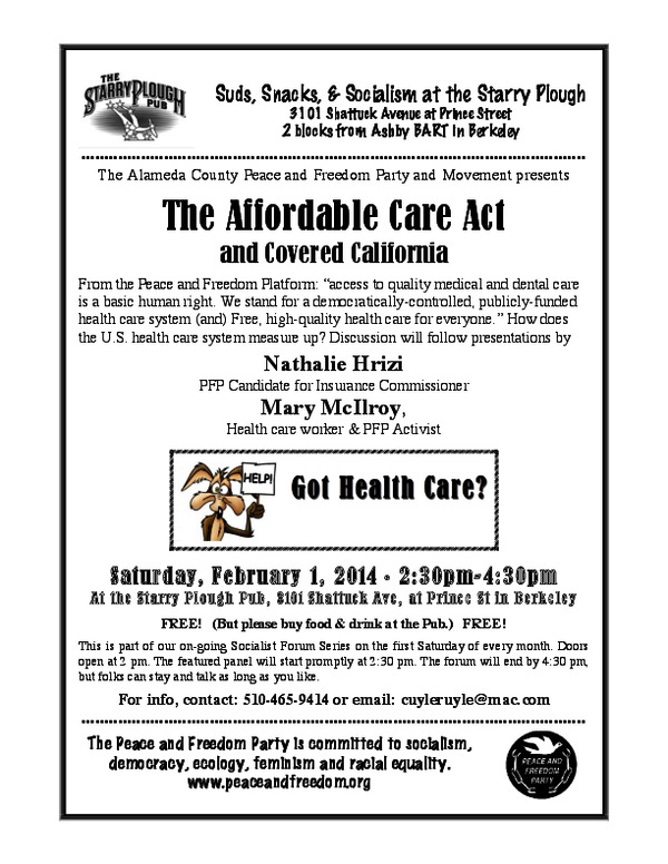 From the Peace and Freedom Platform: “access to quality medical and dental care is a basic human right. We stand for a democratically-controlled, publicly-funded health care system (and) Free, high-quality health care for everyone.” How does the U.S. health care system measure up? Discussion will follow presentations by