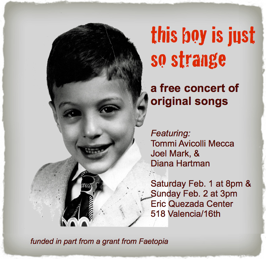 This boy is just so strange, an original musical by Tommi Avicolli Mecca and featuring Joel Mark on acoustic bass and Diana Hartman on vocals and as various characters. Explores the life of a gay activist through snapshots of his life. From his childhood in a poor neighborhood in South Philly to a sudden move to SF in the 90s, this is a different type of musical. And it's FREE.