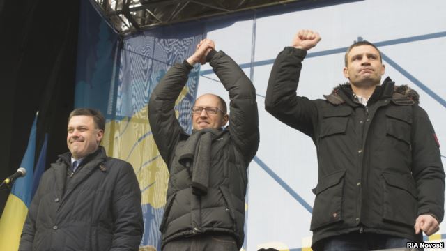Photo: The main coalition leaders of the U.S. and E.U. backed riots in Ukraine. From left to right: Oleh Tyahnybok of the neo-Nazi Svoboda party, Arseniy Yatsenyuk of the Fatherland Party, and Vitali Klitschko of UDAR (Punch). This picture was taken at a rally in Independence Square in December 2013. All three parties are right wing capitalist parties. The Fatherland Party and UDAR have no problem working with the fascist Svoboda movement. For more on why this imperialist backed uprising of rightist forces should be opposed, read my update for this article: