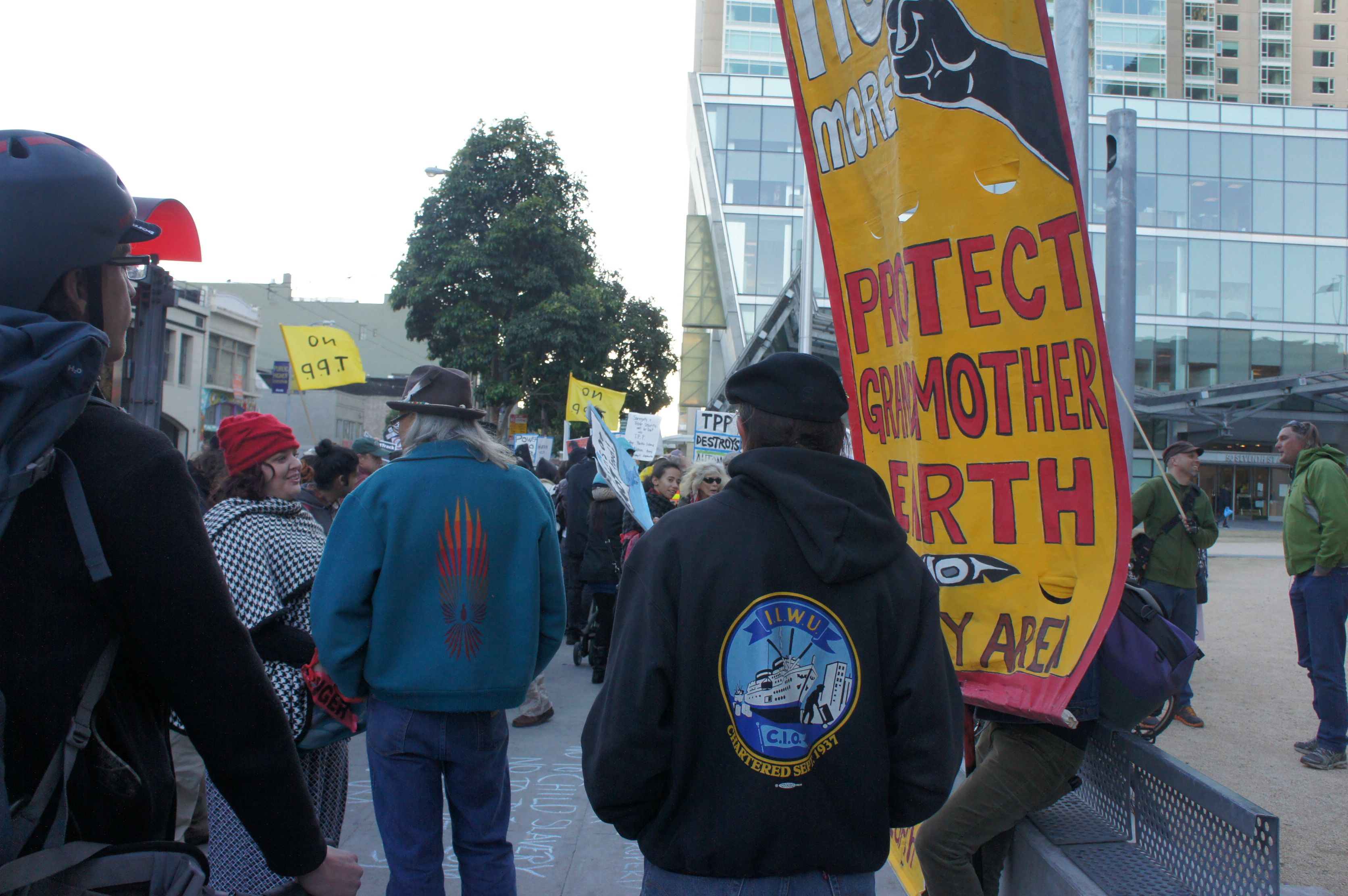Protester numbers swelled during a march down Market Street, eventually reaching an estimated 500. Nancy Pelosi has said publicly that she has concerns about the TPP. Rally organizers lamented that she continues to avoid taking the kind of bold stance against Fast Track and TPP that might make a difference in the legislation's chances.