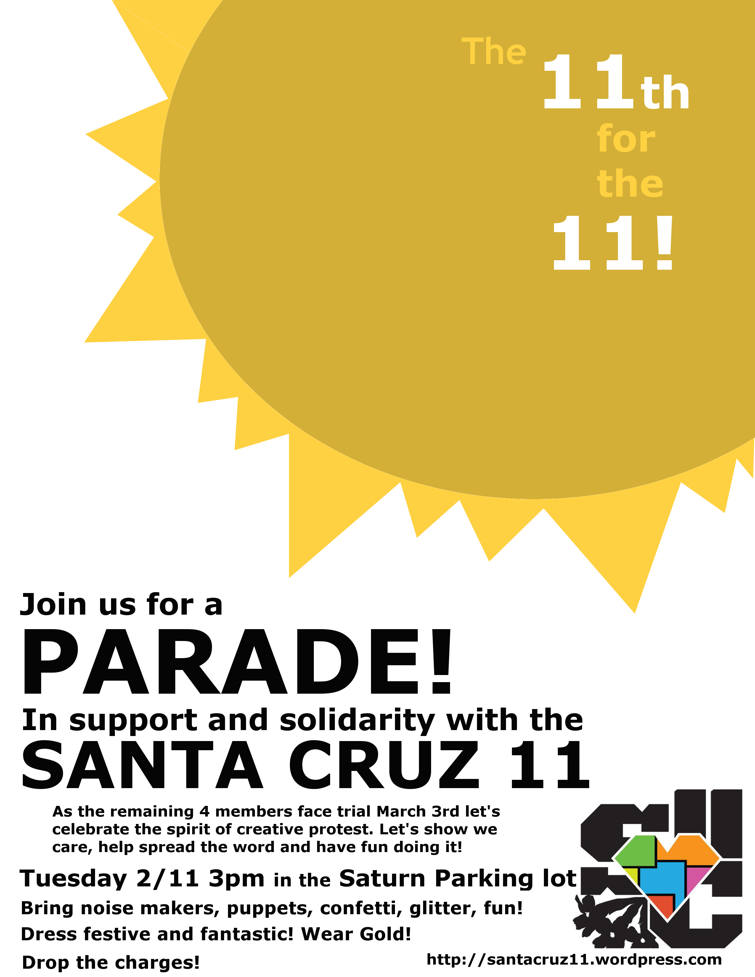 Meeting at 3pm in the parking lot behind the Saturn Cafe in downtown Santa Cruz, we will parade through town spreading the word about the 11, dancing and having fun. Folks are encouraged to wear gold and bring noise makers, puppets, confetti and friends! It's a Parade! Creativity and sillyness are welcome!