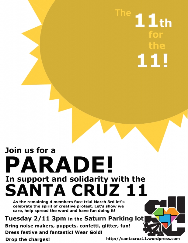 The 11th for the 11! On February 11th you are invited to join in a Parade in support and solidarity with the Santa Cruz 11!