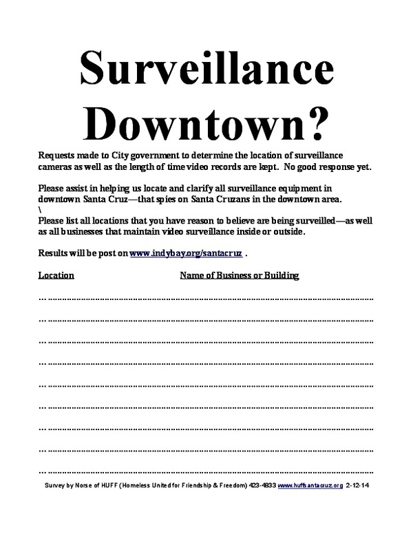 Near Cinema 9; Parking Garages; SC Public Library; ON Washington St.; Police Station Back Doors; Near Stagnano's Fish Warehouse; Clock Tower; Traffic Control Cameras; Outside Ecogoods/New Leaf; Outside S.C. Coffee Roasters overhead lobby area; Pacific Ave: Hidden Cameras & Microphones; Cruzio's Internet outside building; Metro Center