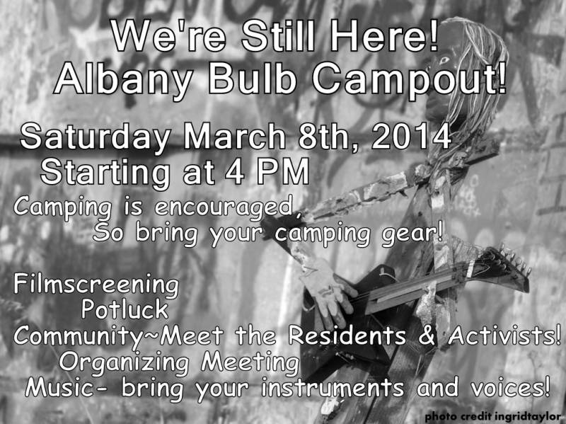 On Saturday, March 8th, we will be converging on the Bulb once again to camp out and claim space. Come support the residents of the Bulb and their efforts to resist being evicted from their homes. There will be a film screening, a chance to meet the residents, workshops, potlucks, and music.