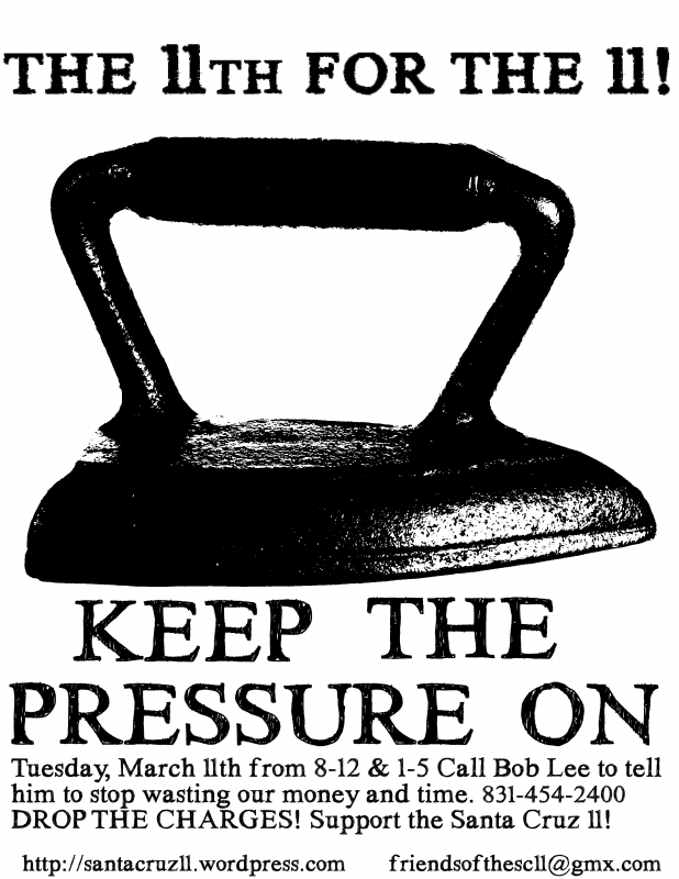 This coming Tuesday, March 11th join us in calling in to Bob Lee's office and telling them to Drop The Charges! From 8-12 and 1-5 call the District Attorneys office at (831) 454-2400 and let them know their actions aren't representing you. The DAs office exists to act on behalf of the residents of Santa Cruz County and has a duty to respond to our opinion.