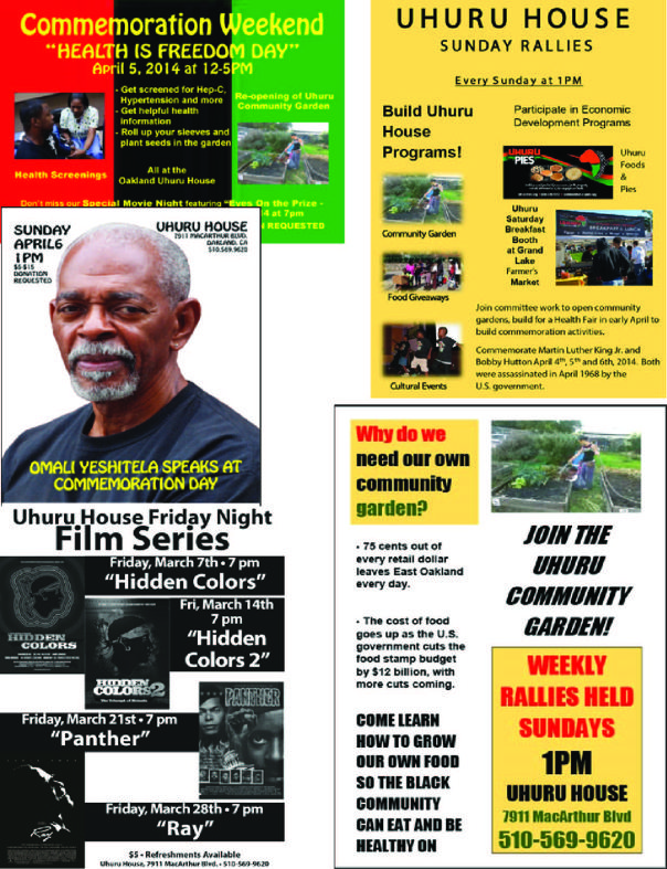 Oakland, CA, April 4-6, 2014,During the first weekend in April, the Uhuru House, located at 7911 MacArthur Blvd in Oakland, will host a series of events for the purpose of establishing ongoing economic development and self-reliance within black communities. The three days of activities will begin on Friday, April 4th at 7pm with the showing of the historical film “Eyes on the Prize: the Black Power Years.”