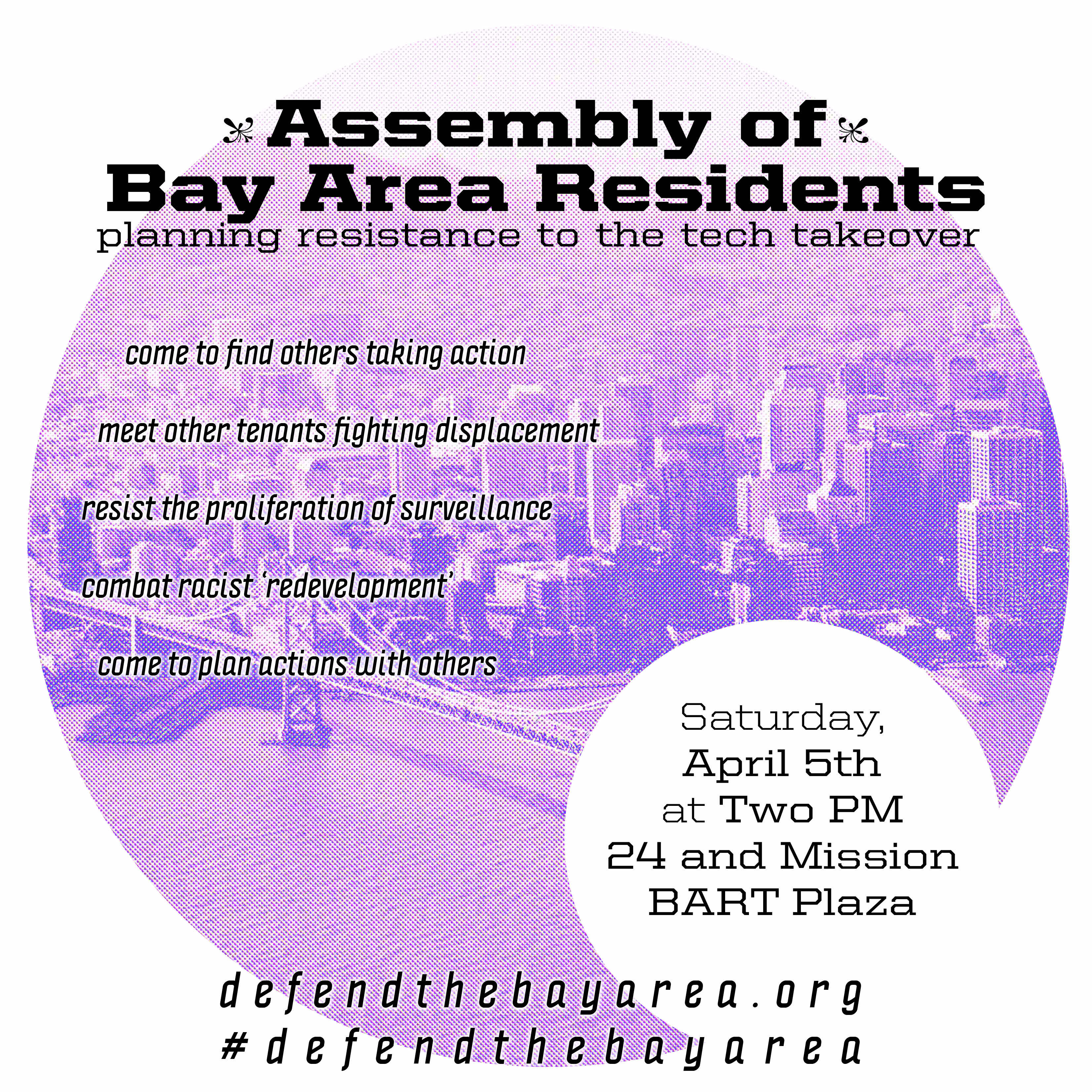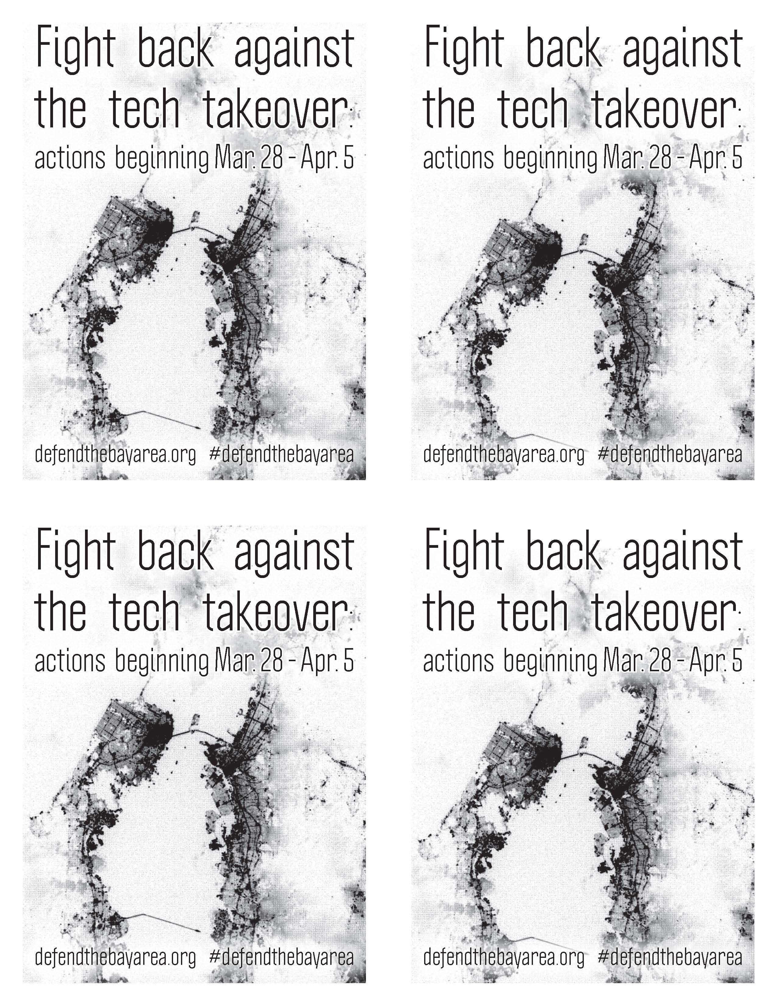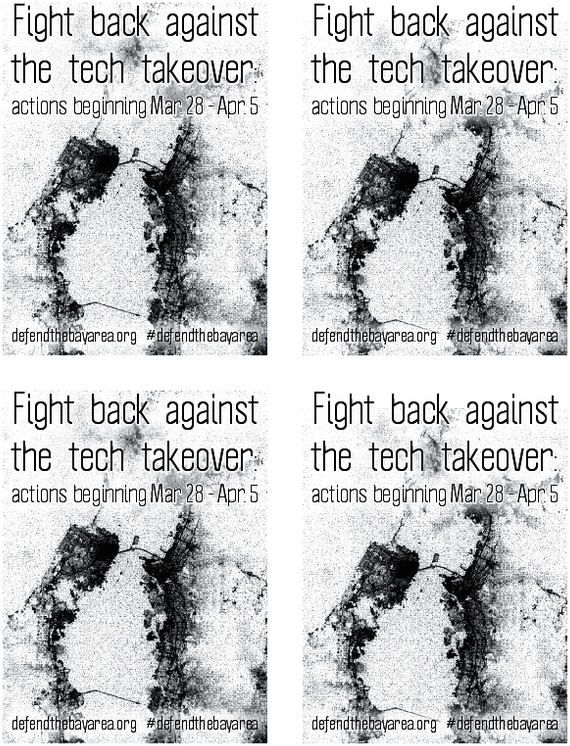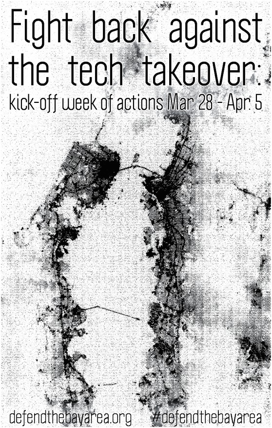 We want to aid in the escalation and expression of this anger, and give people a chance to work together to resist what is happening in San Francisco, in Oakland, and beyond. People are already taking action; we are excited to help as it becomes more frequent and focused. The significance of this moment is that all sorts of people with all sorts of perspectives and politics are pissed off. We may not agree on everything, and we may not have the exact same priorities, but we can and should share ideas and coordinate our resistance in order to cause the most damage to our common enemies. We are issuing a call for all individuals and groups that are concerned with issues of rent, gentrification, surveillance, the police state, development and the destructive implications of the tech industry to begin a systematic campaign starting on March 28. We will use this website, Defend the Bay Area, to allow people to plan and coordinate actions, assemblies, marches, and other events during that week and beyond. Think about what you might do during that week -- with your friends, your affinity group, in your workplaces or communities. If it's something that can be publicized, contact us and we'll help spread the word.
