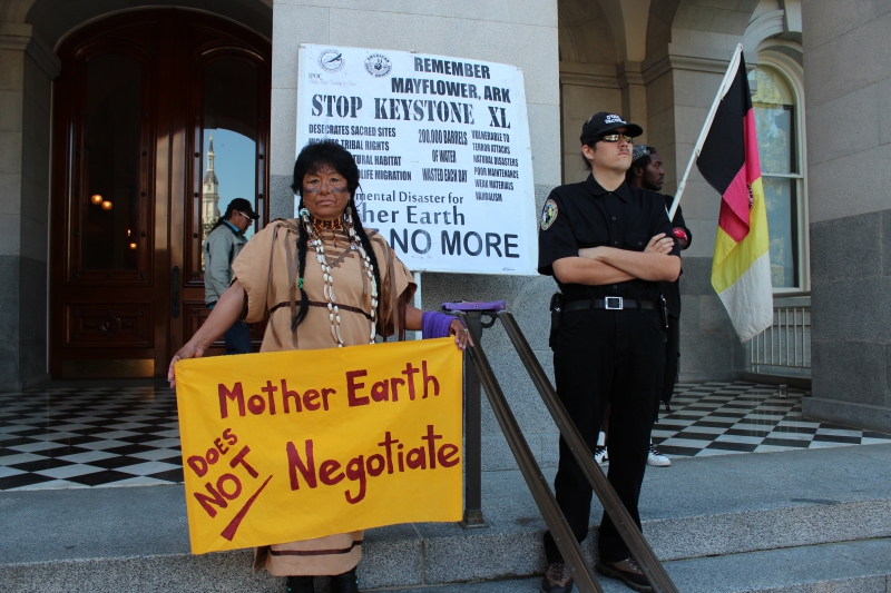 Warrior Woman, a Dakota Indian woman holding a sign stating, “Mother Earth Does Not Negotiate," said, “We’re here to stop fracking and the rape of Mother Earth. Water is the life blood of Mother Earth. The governmental system can’t continue to oppress the people and Mother Earth any longer.”