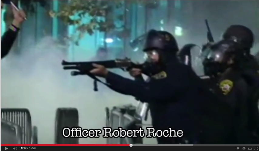 After being shot, Mr. Olsen lay on the pavement critically injured and bleeding from the head, clearly visible very close to the line of police officers. When concerned protesters ran to his aid, OPD Officer Robert Roche threw a flashbang-like CS Blast grenade into their midst, causing them to scatter. The grenade exploded close enough to Mr. Olsen to burn his shoulder as he lay helpless. Civilians re-approached and persisted in carrying Mr. Olsen to safety, screaming for medical aid – but no law enforcement personnel responded or summoned medical attention even though their own policy requires them to provide medical aid to anyone hit with a SIM.