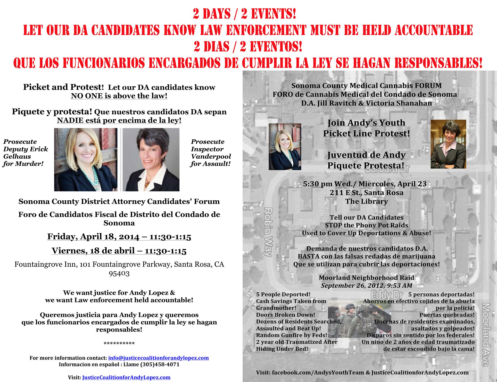 Picket and Protest to let our DA candidates know that no one is above the law! We want justice for Andy Lopez and we want Law enforcement held accountable!