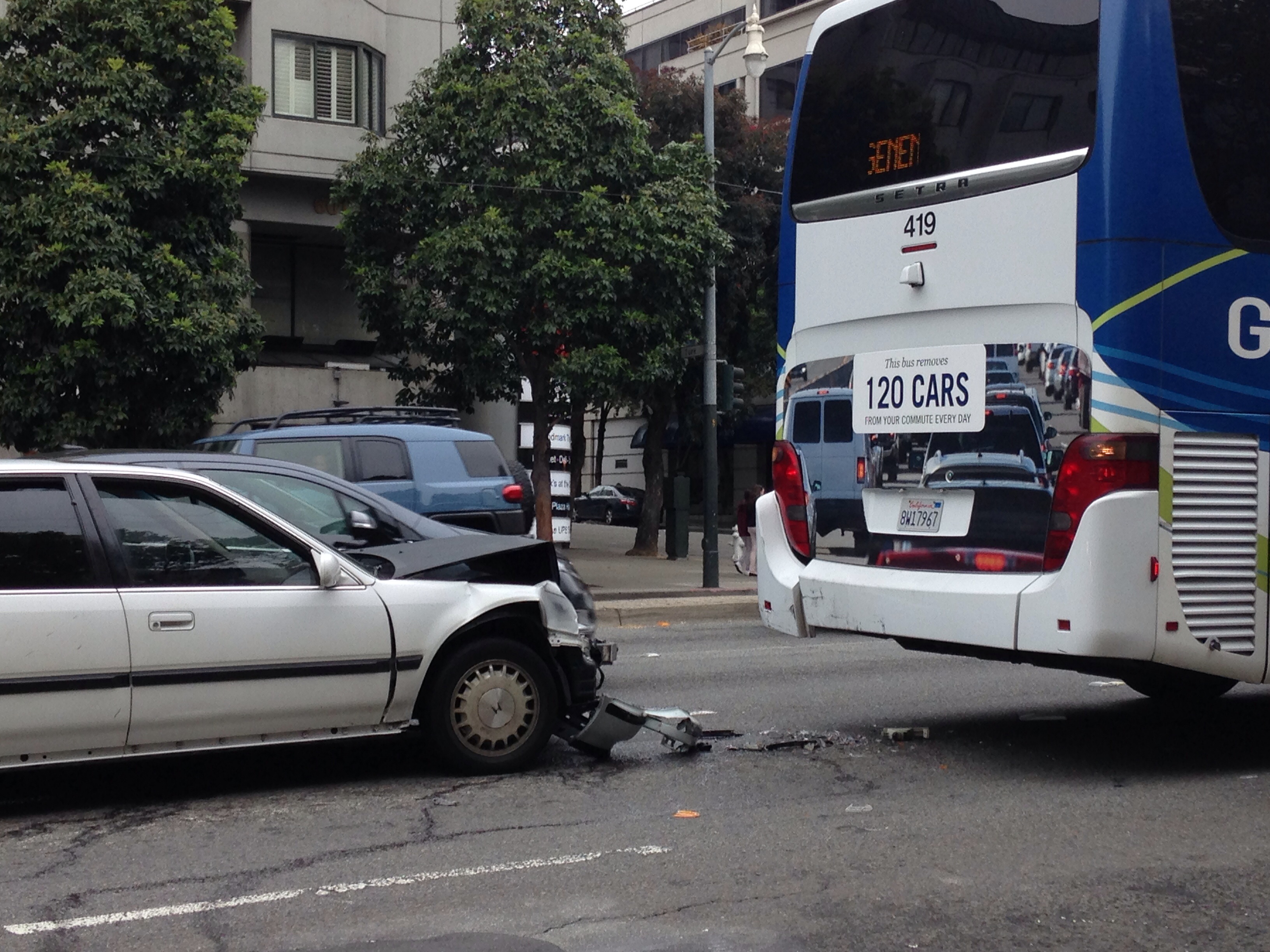 Look at the back of the bus. What do you see? Yes a reflection or picture of traffic that is not actually behind the bus.