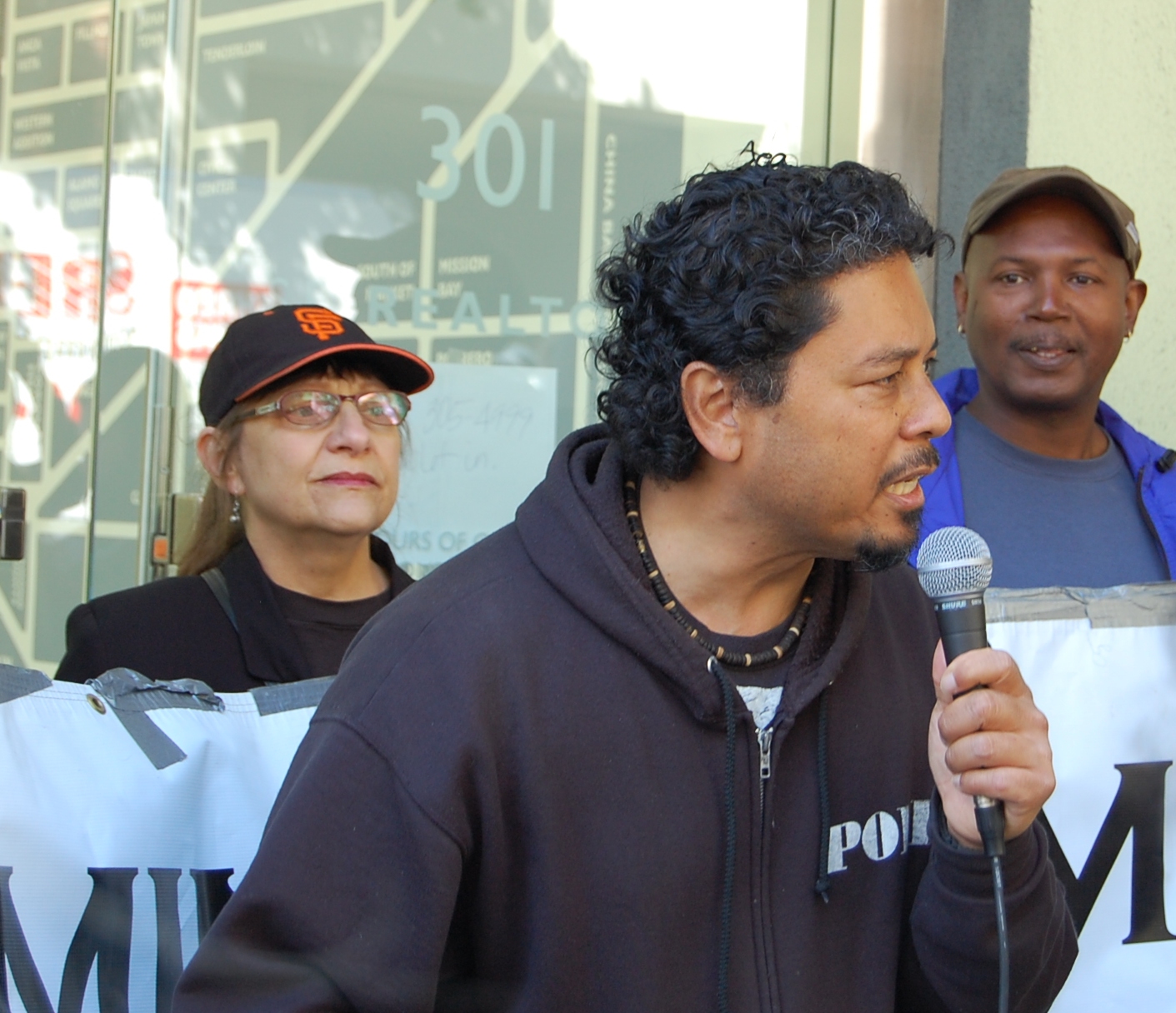 Benito Santiago, a special education teacher and long-time activist continues to fight his Elllis Act eviction. He called on us to “Stand Your Ground.” Benito spoke of the irony of being evicted as we go into the 37- year anniversary of the I Hotel. Benito led us in drumming and Tony chanted names of those facing evictions to close out our action