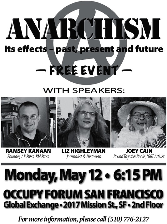 Panel Discussion on anarchism -- past, present, and future -- with Ramsey Kanaan (AK Press & PM Press), Liz Highleyman (journalist and historian), and Joey Cain (Bound Together Bookstore, LGBT activist)