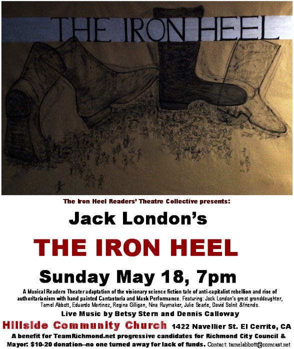 Jack London’s THE IRON HEEL Sunday May 18, 7pm A Musical Readers Theater adaptation of the visionary science fiction tale of anti-capitalist rebellion and rise of authoritarianism with hand painted Cantastoria and Mask Performance. Featuring: Jack London’s great granddaughter,Tarnel Abbott, Eduardo Martinez, Regina Gilligan, Nina Ruymaker, Julie Searle, David Solnit & friends Live Music by Betsy Stern and Dennis Calloway. Hillside Community Church 1422 Navellier St. El Cerrito, CA Benefit for TeamRichmond.net progressive candidates for Richmond City Council & Mayor: $10-20 donation--no one turned away for lack of funds. Contact: tarnelabbott [at] comcast.net https://www.facebook.com/events/1415230825407649/