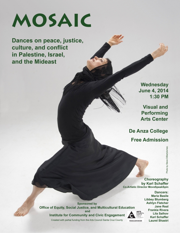 On June 4, 2014 at 1:30 PM at its Visual and Performing Arts Center, De Anza College will host a performance of Mosaic, a dance concert by dance company MoveSpeakSpin and choreographer Karl Schaffer about peace, justice, culture, and conflict in the Middle East. The concert is sponsored by the De Anza College Institute for Community and Civic Engagement and the Office of Equity, Social Justice, and Multicultural Education (OESJME) and admission is free. The performance will be followed by a discussion with the dancers led by OESJME Director Veronica Neal. The title refers to the range of subjects that inspired the choreography, from the Palestinian/Israeli struggle to the mosaic tilings common in Middle Eastern art, and included are several dances set to Jewish Diaspora and Arabic folk songs recorded by Santa Cruz world music group Zambra. The mathematics of Islamic tiling designs will be portrayed through live “video tessellations,” or video mosaics, of dancers.