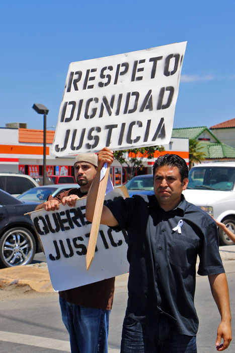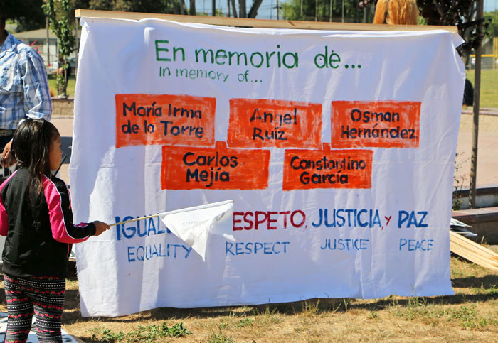 During the march on May 25, individuals carried three small coffins for the entire route. A banner held at the front of the march read, "In Memory Of...María Irma de la Torre, Angel Ruiz, Osman Hernandez, Carlos Mejia, and Constantino Garcia."
