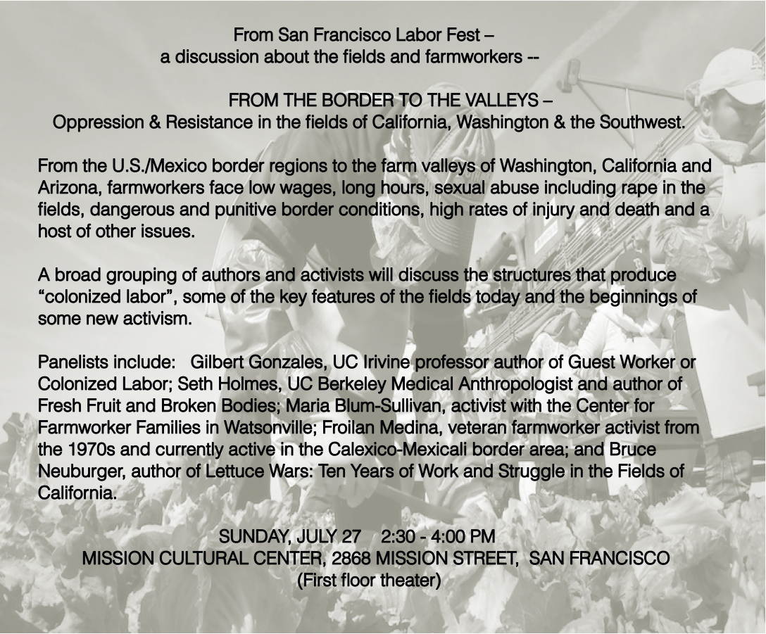 Gilbert Gonzales, UCI professor author of Guest Worker or Colonized Labor Seth Holmes, UCB Medical Anthropologist and author of Fresh Fruit and Broken Bodies Maria Blum-Sullivan, activist with the Center for Farmworker Families in Watsonville Froilan Medina, veteran farmworker activist from the 1970s and currently active in the Calexico-Mexicali border area Bruce Neuburger, author of Lettuce Wars: Ten Years of Work and Struggle in the Fields of California.