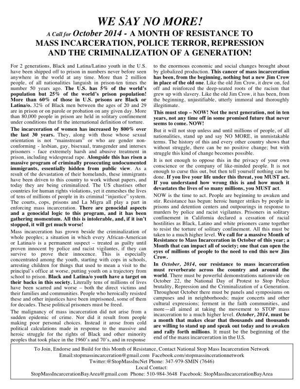 Read the Call, and take the pledge to be part of the October Month of Resistance to Mass Incarceration, Police Terror, Repression and the Criminalization of a Generation, and then come help shape and organize the month, and take responsibility to make it as powerful as possible.
