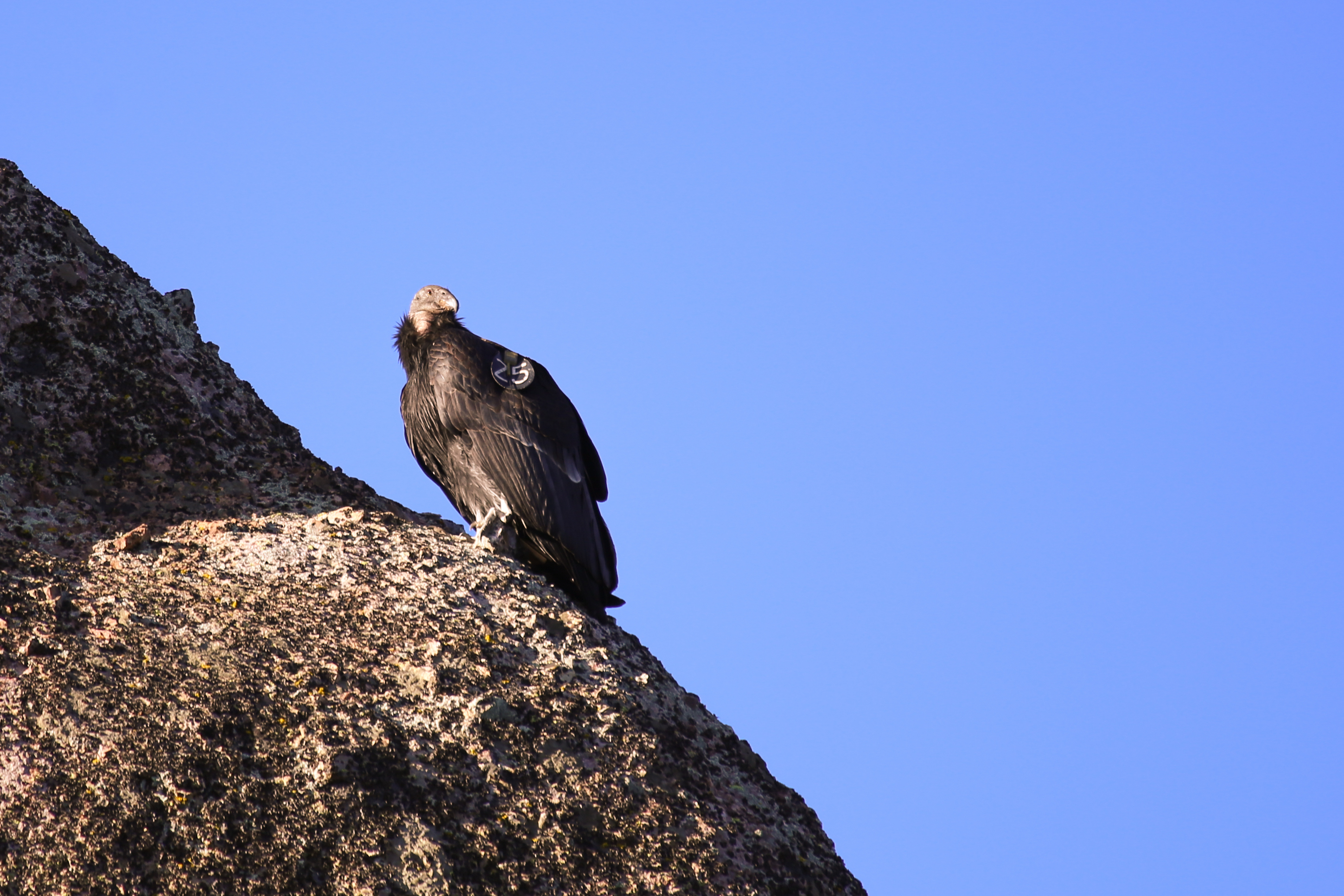 Pinnacles National Park is one of five California Condor Recovery Plan release sites, and a great place to see the rare birds in their natural habitat. From the High Peaks Trail, the Condors are easily spotted drifting amidst the rock spires and canyon walls, occasionally settling on one of the outcrops, as California Condor #25 is seen doing here. The park is home to 32 of the Critically Endangered birds, protecting a significant portion of the estimated 226 that exist in the wild.