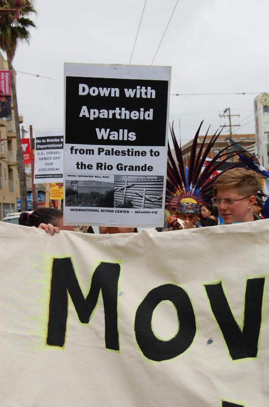 Latino activists in solidarity with Palestines marched down Market Street Saturday, August 2, in a unity call for saving the children of Central America who are languishing at the US-Mexican border and the children dying in Gaza. Save the children in Guatemala, El Salvador, Honduras, Mexico, and Palestine. Movimiento por la Reunifacacion Familiar organizers reached out to everyone to join together in a march chanting, “No mas ninos deportados nuestros ninos son sagrados!” “No more children deported; our children are sacred.” After speakers at 16th/Mission, the protesters took the street and marched to 24th/Mission for another rally. Everyone was given chalk and invited to join in an art project, drawing stick figures to represent the immigrant children detained at the border. Also the names of the 300 children killed in Gaza can be seen written on our sidewalks as a reminder -- our children are sacred.