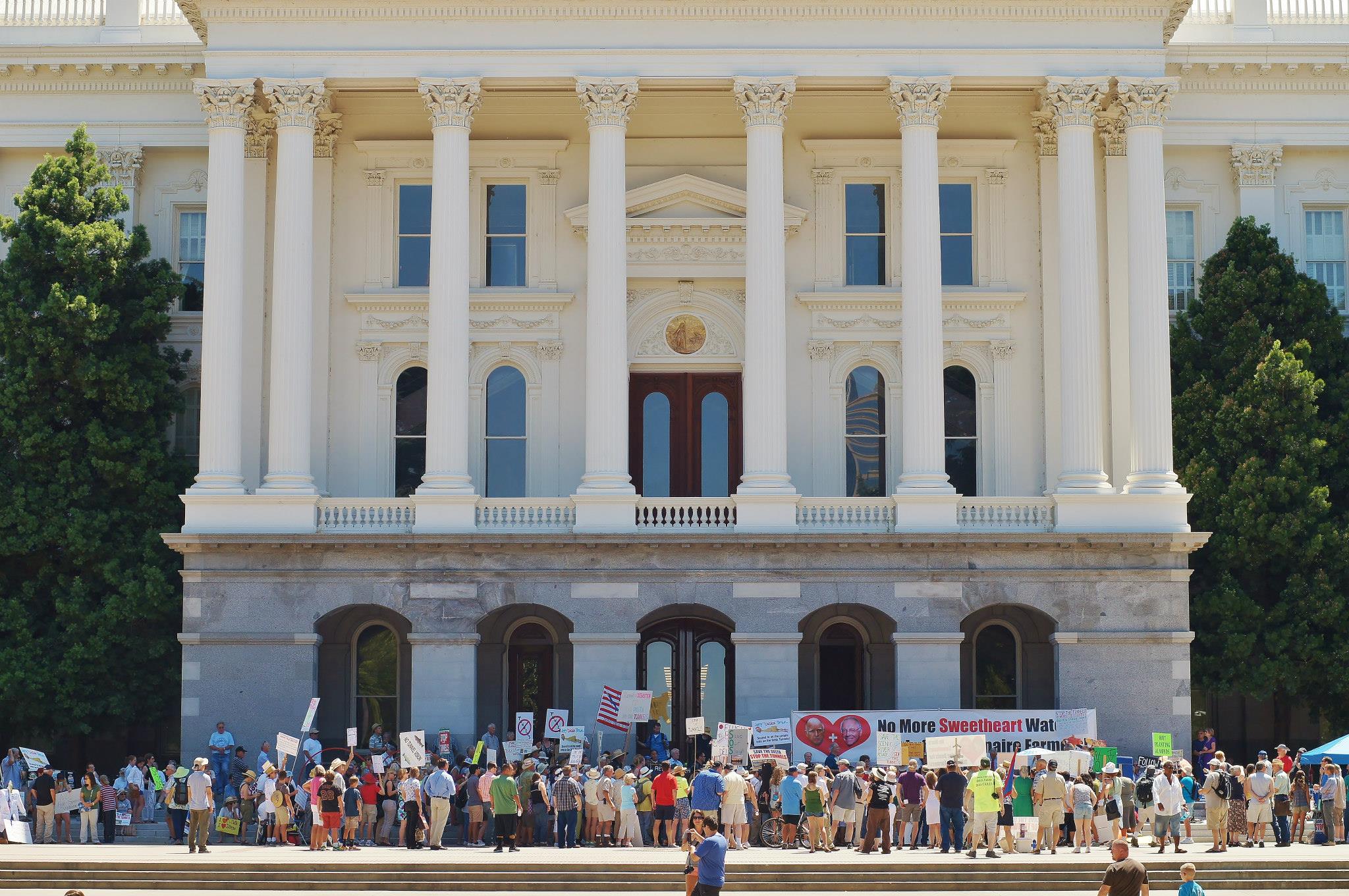 Mark Wilson, Delta farmer, pointed out the irony of the brown lawns now greeting visitors at the Capitol after a drought year when California reservoirs were systematically emptied to deliver water to corporate agribusiness, the Kern Water Bank and Southern California reservoirs.