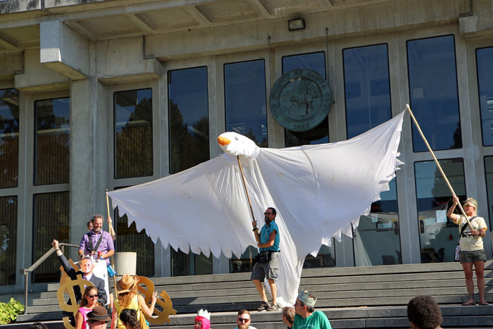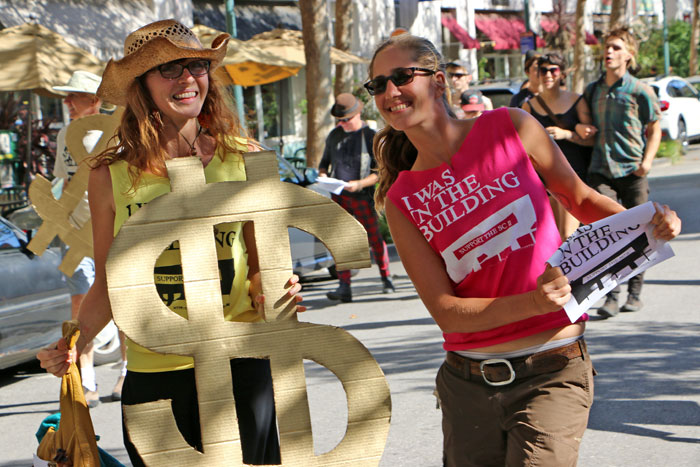 On August 22, another energetic parade was held in support of the final four Santa Cruz Eleven defendants, who are still facing criminal charges in relation to the 2011 occupation of the vacant bank building located at 75 River Street. The course of the parade "followed the money" from District Attorney Bob Lee, who is prosecuting the case, to Wells Fargo Bank. Community members dressed in green and carried large, gold dollar signs. They followed a suit-clad parader wearing a Bob Lee mask who lead them to the Wells Fargo branch located at 74 River Street. Wells Fargo is the so-called plaintiff in the case, and defendants have recently discovered Lee has a financial relationship with the bank. The defendants are due back in court in Santa Cruz on Wednesday, August 27 at 9am to further press the District Attorney's office on this issue.