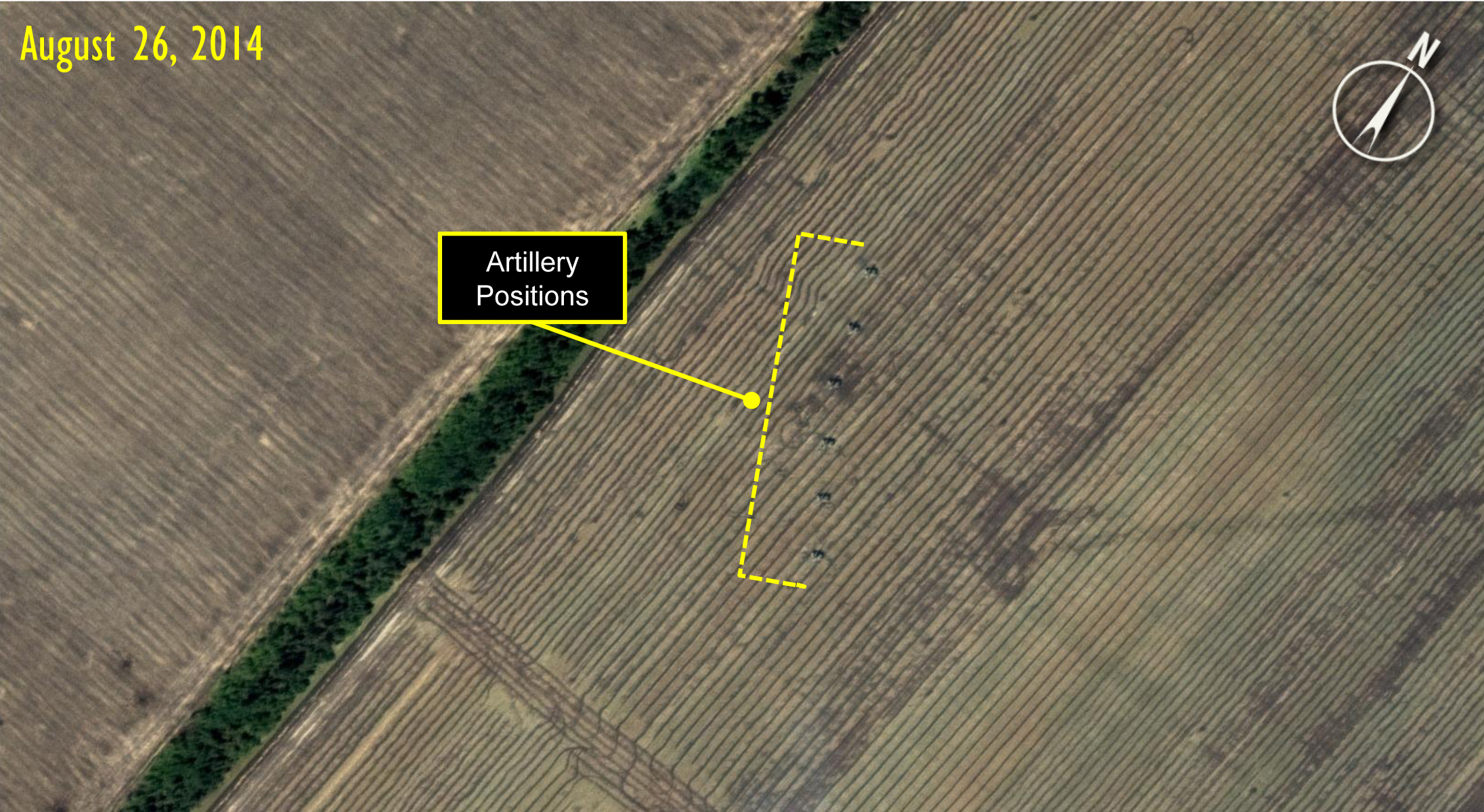 Another similar artillery position can be seen in a field northeast of the first, also within Ukrainian territory. Imagery from 26 August 2014 shows six relatively advanced self-propelled howitzers (likely 2S19 Msta-S 152-mm) in firing positions facing southwest at Ukrainian army locations.