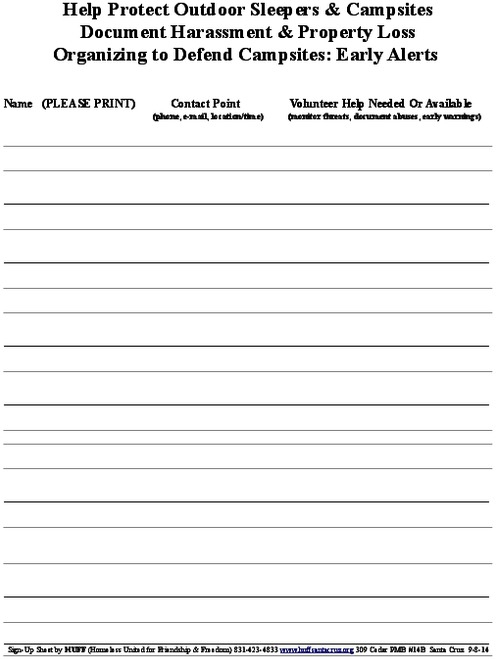 Homeless Encampment Protection Volunteer Sheet https://www.indybay.org/uploads/2014/09/08/homeless_survival_volunteer_petition__modified_.pdf