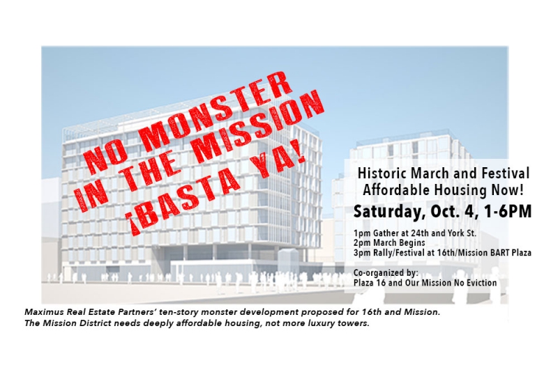 The march will finish at 16th and Mission Plaza where we’ll have a rally against “The Monster in the Mission” and celebrate our community and people power with live music, art, and food.