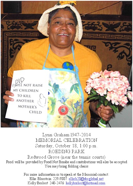 Lynn Graham, WILPF member, Raging Granny and longtime Food Not Bombs volunteer, passed away in August 2014.