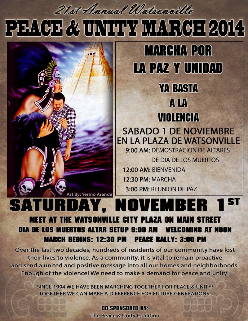 WHERE: Watsonville City Plaza & March will take place throughout various neighborhoods. This grassroots event is sponsored by the Watsonville Peace and Unity Coalition, a coalition of students, parents, teachers, law enforcement, local businesses, unions, community, arts, churches, and family members who have lost their loved ones to violence.