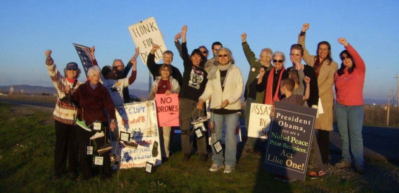 Barry Binks, a Veterans For Peace foot soldier, has been religiously showing up here at Beale Air Force base, east of Sacramento, month after month. With him is an incredible affinity group of mostly Elder citizens, who have been setting up information outlets, banners, signage and even blockading the entrance to the base, triggering their arrest by the MPs. The dedicated dozen seasoned peace activists there with us this morning, I learned later, collectively had many arrests from Washington DC to California.