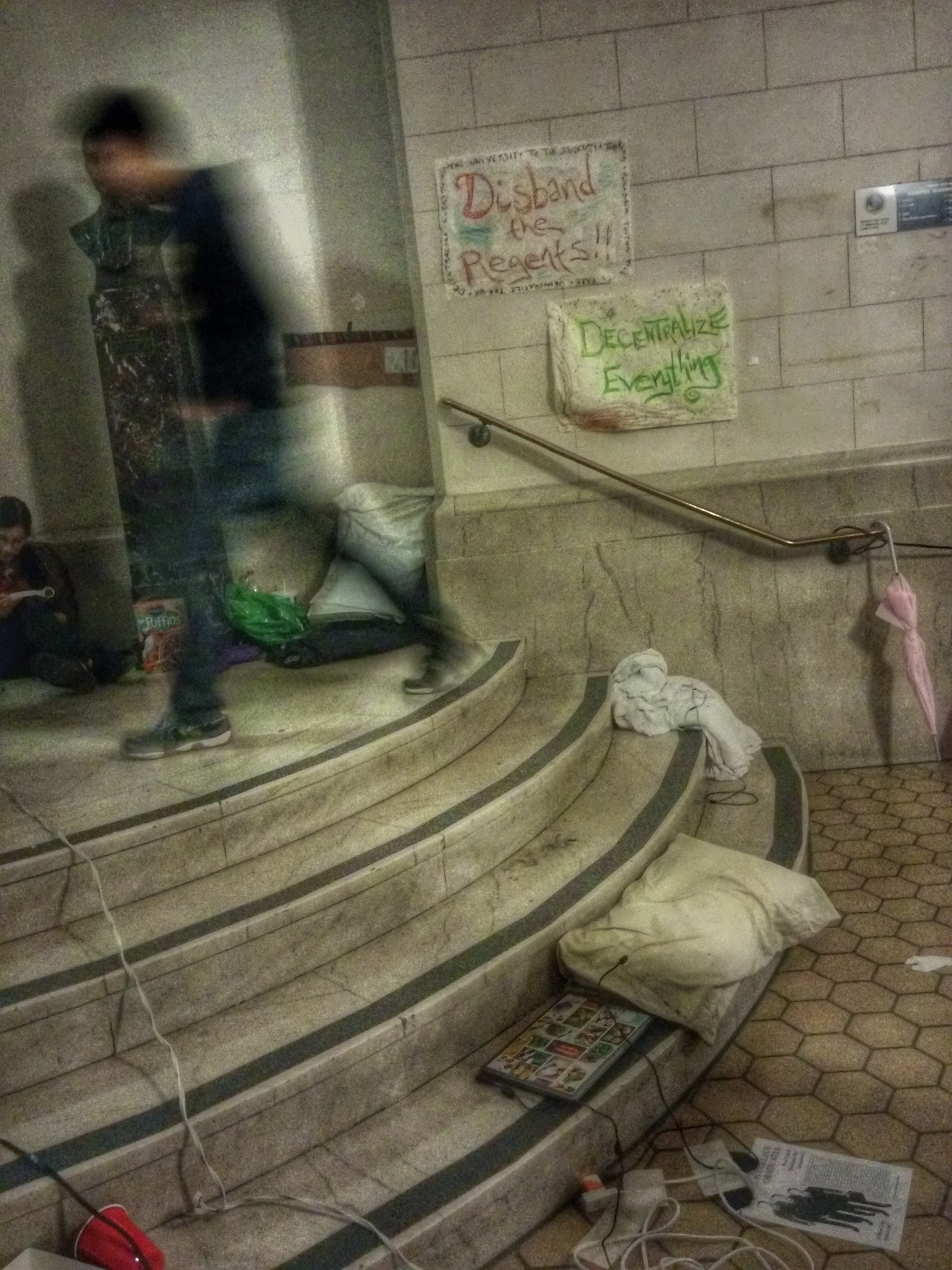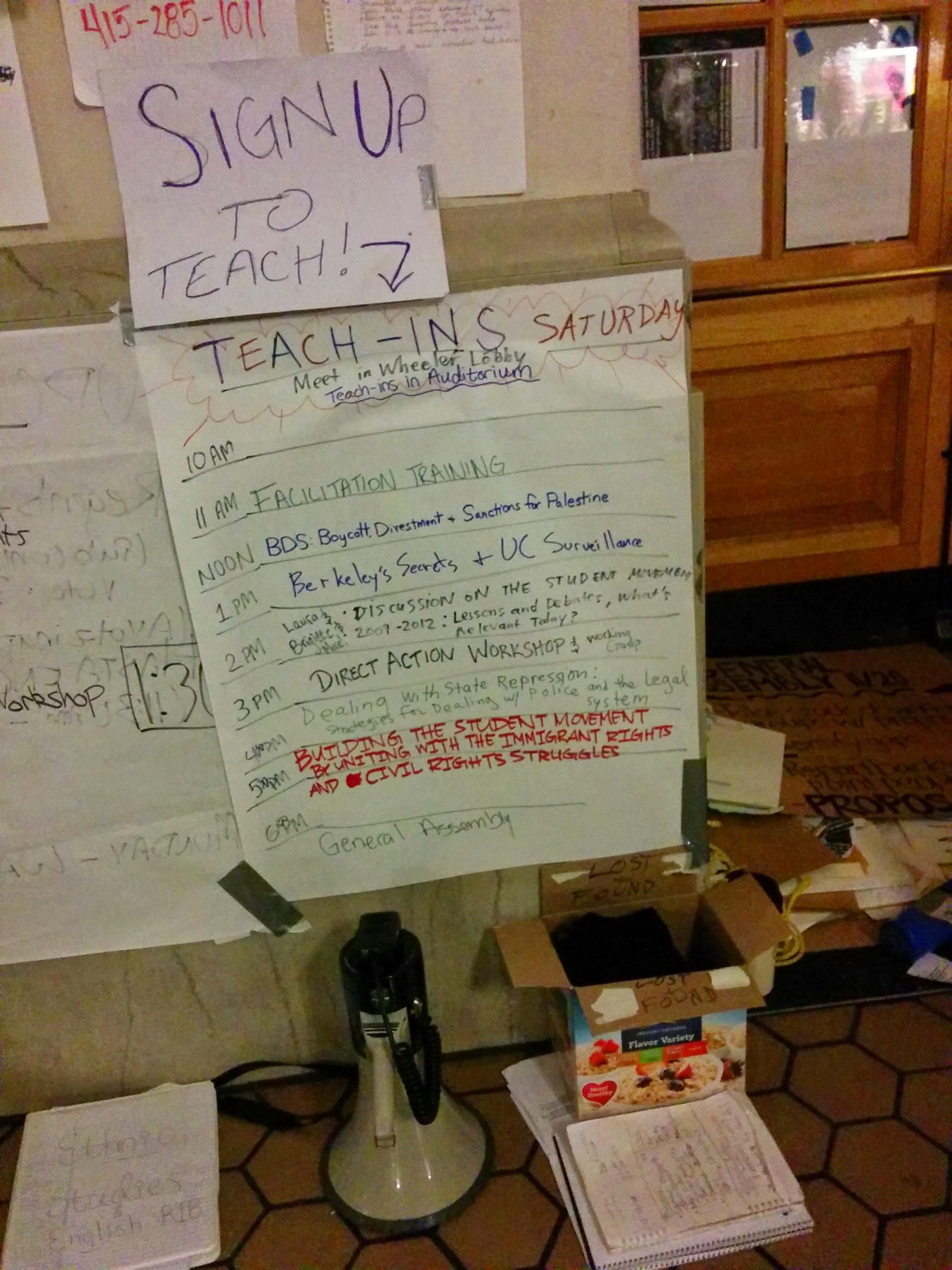 At this moment, Wheeler Hall is bustling with activity: students are engaging in discussions, sharing stories, tackling specific parts of the campaign through working groups, holding assemblies to mobilize, making visual and performance art, eating, cleaning, doing homework, and so on. A walkout is scheduled for Monday, November 24th at noon, coordinated with other UC’s. We are enthusiastic about working with press teams and can be reached by phone or email and can arrange interviews upon request.