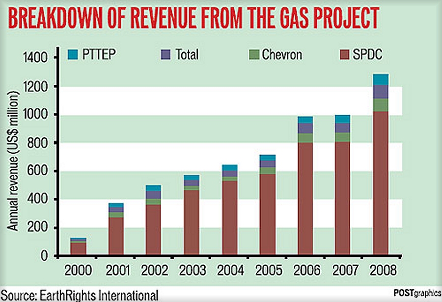 “Burma’s Yadana gas pipeline, run by the two companies along with Thai firm PTTEP, made billions of dollars for the military leaders, the Paris-based group EarthRights International said, citing data from the firms. The Thailand based NGO also branded the companies complicit in human rights abuses such as targeted killings and forced labor at the pipeline.”