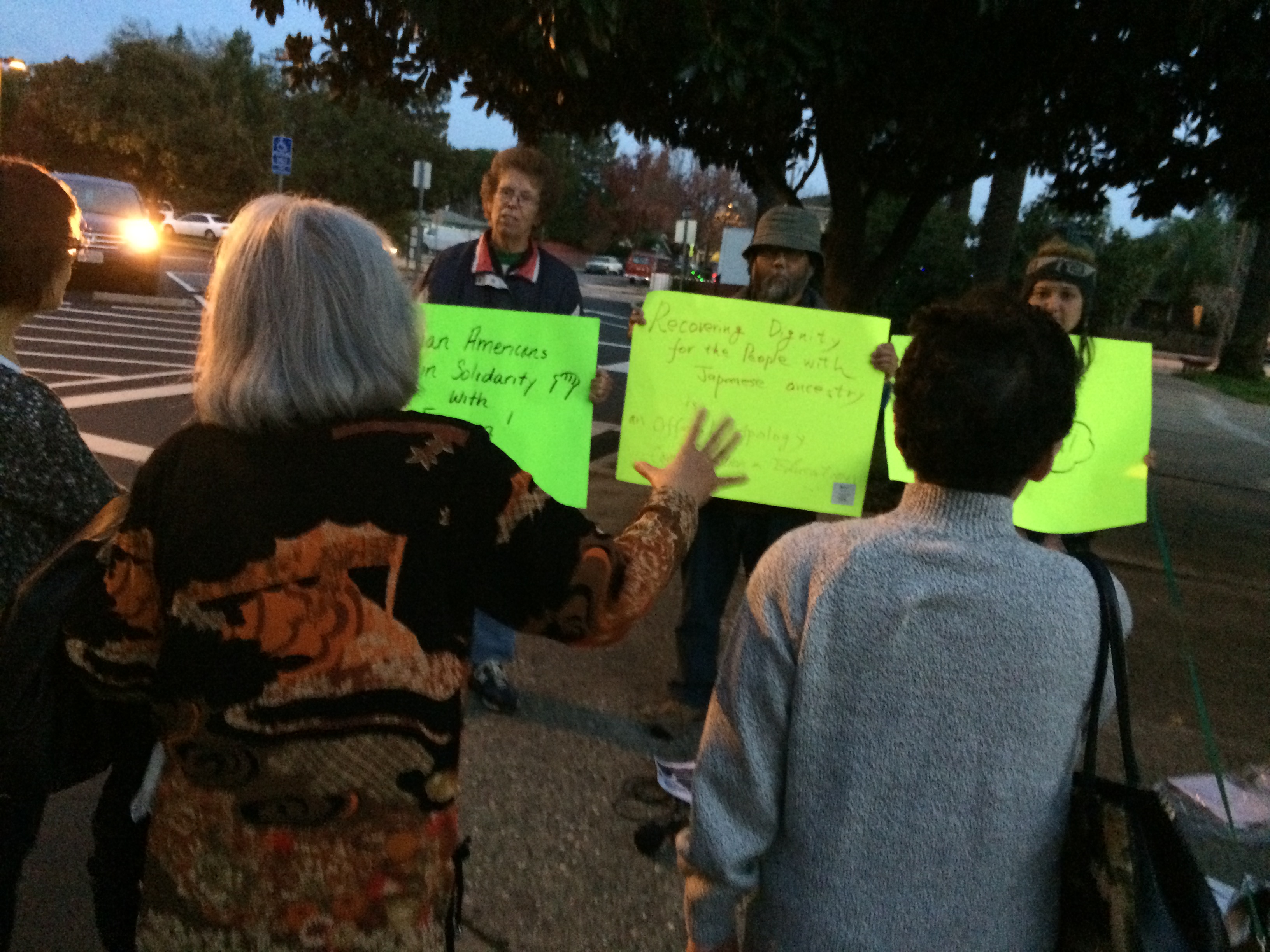 To their credit, one of the leaders and several supporters of Nadeshiko Action engaged in conversation with the protesters, who stood with signs outside the the Redwood Community Center where the press event was held. The surprised visitors from Japan asked, "How did you know we were here?" and "Why do you call us racists when we have Korean and Chinese friends?"