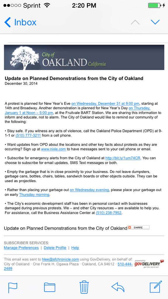 The march began moving north on Telegraph, hoping to swing through Uptown before heading to the jail, unlike previous years. A sound system blasting hip hop led the crowd to the Fox Theatre, where people held the intersection at 19th St. The police kept a large presence around the march, with cars on all sides and several walking directly behind us. Here, the first bottle was thrown at a police cruiser that reversed frantically to avoid it.