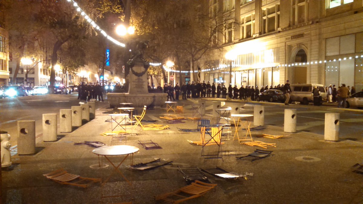 Elsewhere, several people reconvened directly at the jail on 7th St, where more fireworks were shot in the air while others wrote graffiti. Some inmates flashed their lights to the crowd outside. Suddenly, sheriffs ran outside and shot projectiles at the crowd, rumored to have been pepper-balls. With the objective of celebrating New Year’s with the inmates accomplished, and the escalating repression in the streets, people headed home, or perhaps to their post-demo parties.