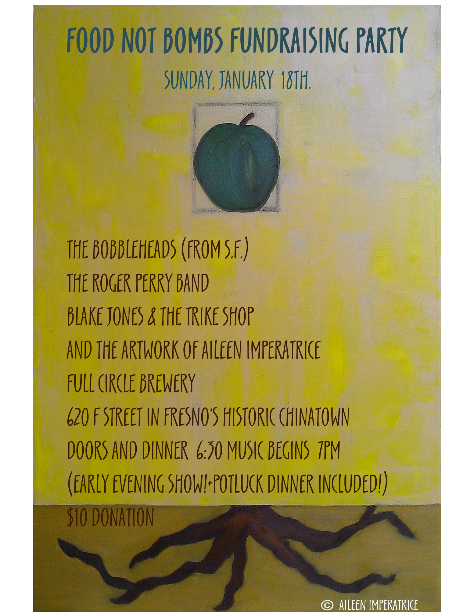 Food Not Bombs Fresno is holding their annual fundraising party on Sunday, January 18th at the Full Circle Brewery (620 F Street). Come on out for a night of live music to help feed Fresno’s hungry! You will be delighted by The Bobbleheads (a pop band from SF), local favorites The Roger Perry Band, and Blake Jones and the Trike Shop. Artwork by Aileen Imperatrice will also be featured. Early Evening Show! Potluck vegetarian dinner is included! Doors and dinner at 6:30pm. Music starts at 7:00pm. $10 donation.