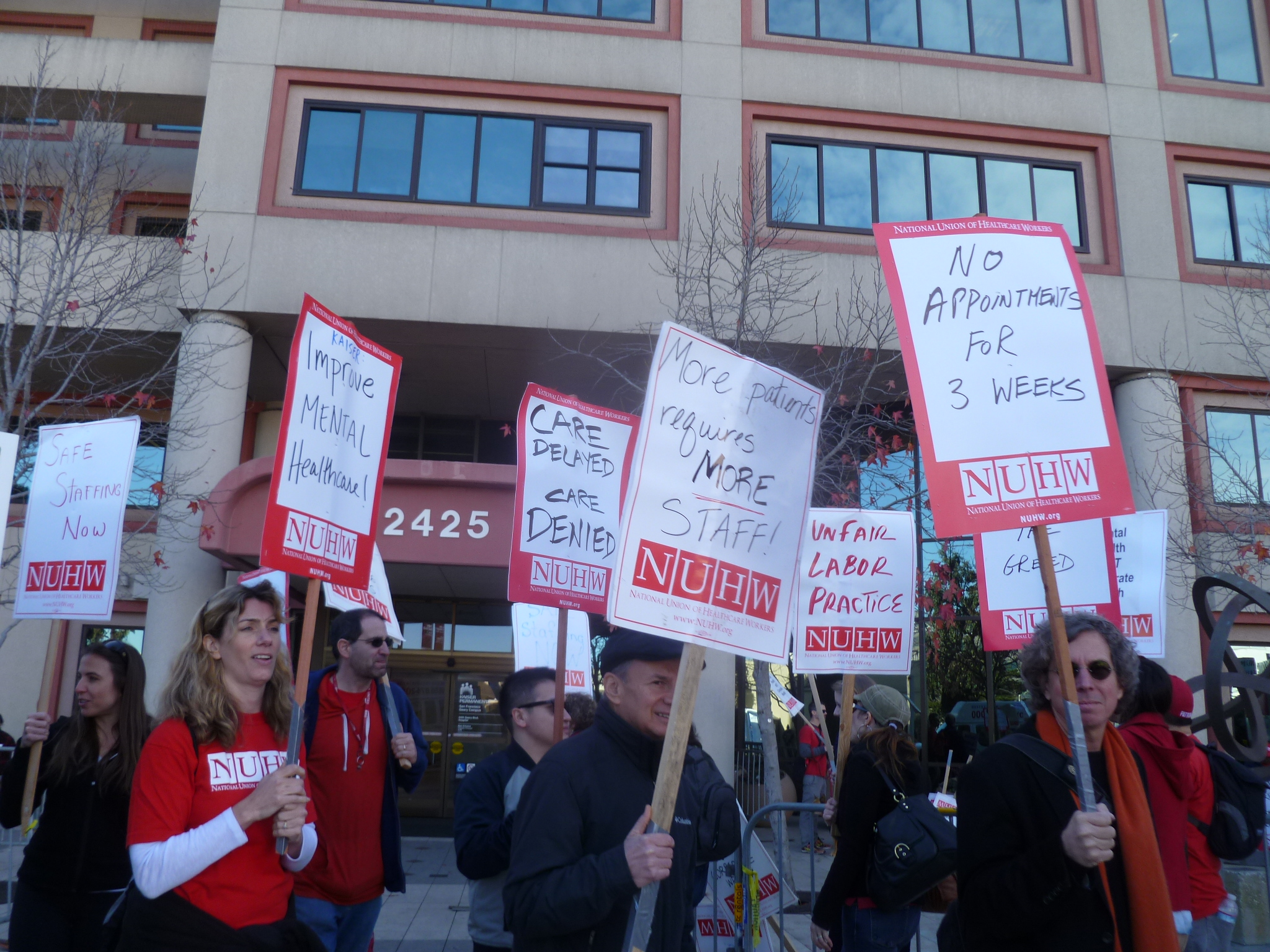 Hundreds of Kaiser NUHW members launched a statewide strike against short staffing and systemic problems particularly for members with mental health issues. Kaiser which is increasing by hundreds of thousands of new members is refusing to provide proper staffing leading to suicides and other health and safety problems. This picket and rally took place on January 12, 2015 at the San Francisco Kaiser. Some patients have committed suicide after the failure of Kaiser to take care of their health needs