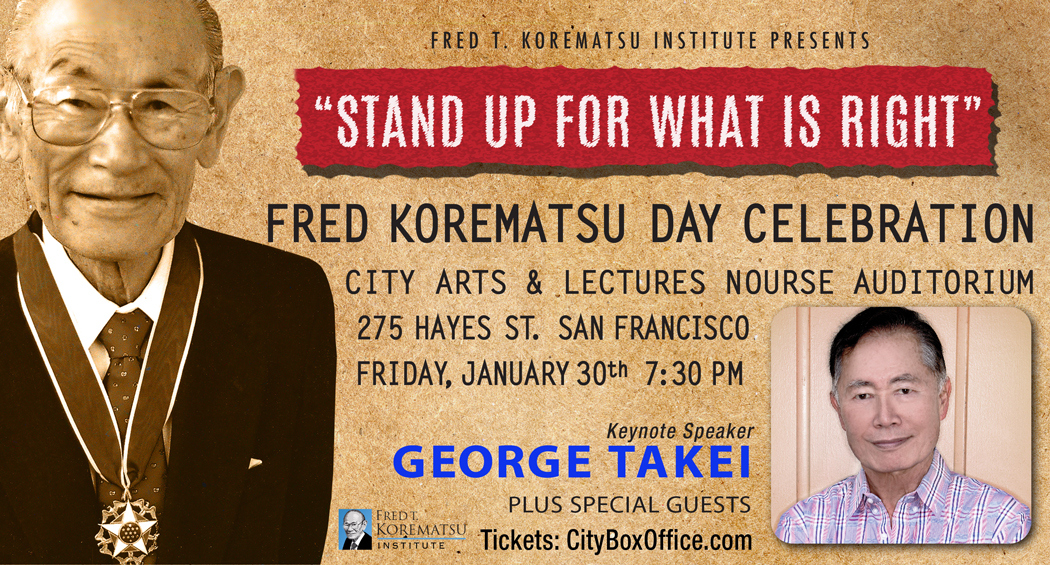 George Takei will keynote the 5th Annual Fred Korematsu Day Celebration on Friday, January 30, 2015, from 7:30 p.m. to 9 P.M. at City Arts and Lectures-Nourse Auditorium on 275 Hayes Street in San Francisco.
