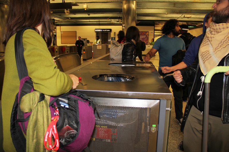 As protesters began to gather in the station, before the protest officially commenced, BART prevented eastbound trains from dropping off or picking up new passengers. Those trains would stop in the station but not open their doors. A woman in a wheelchair banged incessantly on the door, but the train operator would not let her off of the train. Westbound trains heading deeper into San Francisco continued to allow passengers on and off in the station. About 10 minutes past 7am, protesters began to bang their spoons on station support columns, the platform floor, and BART trains. BART quickly began to announce via their in-station electronic message signs that the station was closed. The noise created by the spoons made the station far too loud for any possible verbal police commands to be heard.