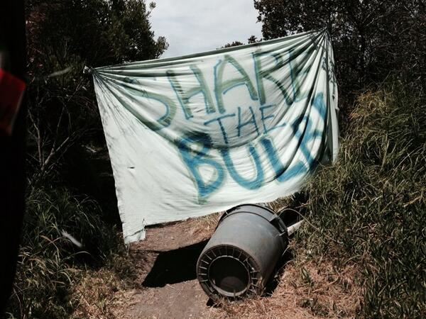 While the issue of gentrification in the bay area was being brought to the forefront, another struggle against displacement was also coming to a head in the small town of Albany, just south of Berkeley. The Albany Bulb, a former landfill and home to a community of up to 70 squatters as well as a haven for off-leash dogs, hikers, and rebel artists, was facing an eviction attempt which began in the summer of 2013. At the end of that year, the struggle had intensified and used a variety of tactics in order to halt the removal of the residents. The eviction was backed by local elites and the Sierra Club, all which sought to cleanse the Bulb of everything which made it popular. From open assemblies, out-door concerts, day long festivals and history tours, to rock barricades and police blockades, anarchists and other radicals worked to draw in the public to the struggle and also physically stop the eviction. In January of 2014, this battle continued with marches and campouts on Salono Ave. with short occupations, film showings, and art walks happening through the spring.