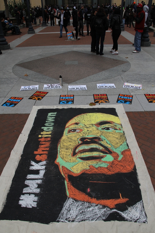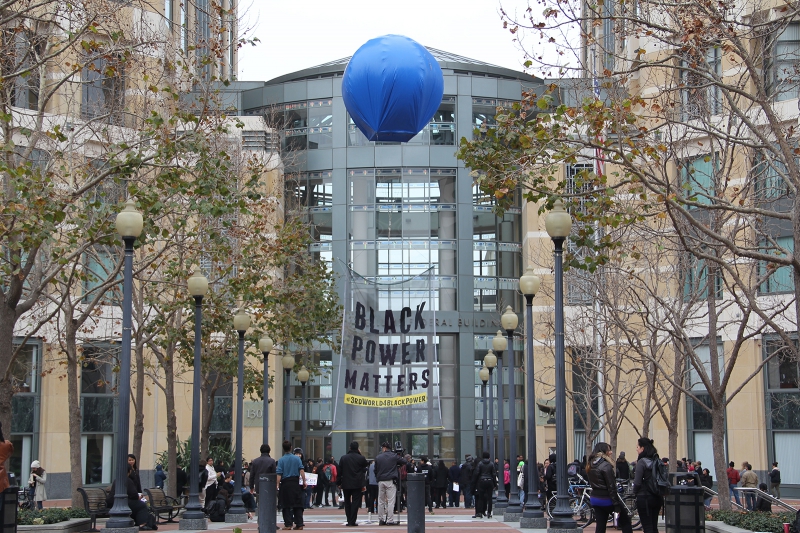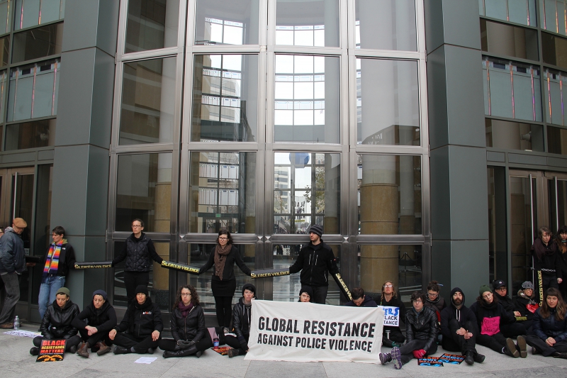 In solidarity with Black Lives Matter activists across the country who set out to "Reclaim Martin Luther King's Legacy" for MLK Day 2015, Oakland's Anti-Police Terrorism Project (APTP) called for 96 hours of direct action in the San Francisco Bay Area. Launching the four-day weekend of actions in the Bay Area was a surprise Friday morning lockdown of the two main entrances to the Ronald Dellums Federal Building complex. Over two dozen activists arrived at the federal building before dawn and slipped their arms into lockboxes and locked chains around their waists, symbolically blocking the main doors for 4 hours and 28 minutes. Hundreds more came to show support, speak, chant, sing, and dance while the action remained in effect. There were no arrests.