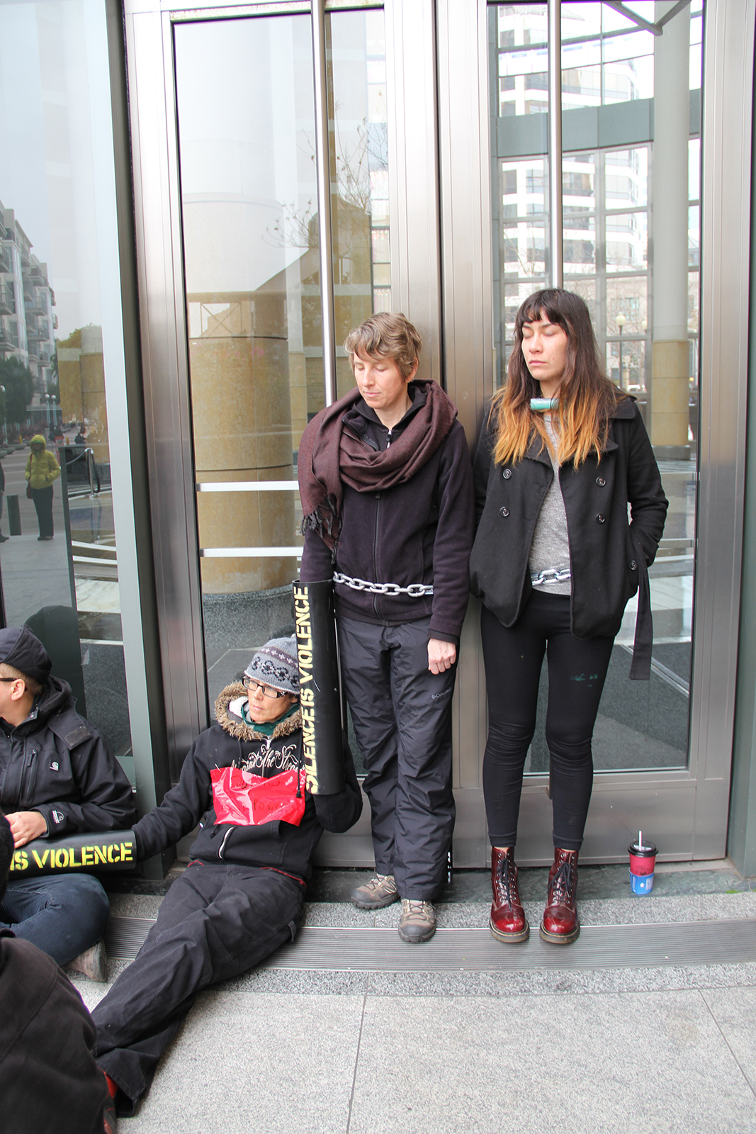 U.S. marshals guarding the the building originally threatened to arrest those locking down the main entrances, but protesters negotiated to be able to remain in place for four hours and twenty-eight minutes since there were side doors open whereby those who needed access to the complex could come and go.