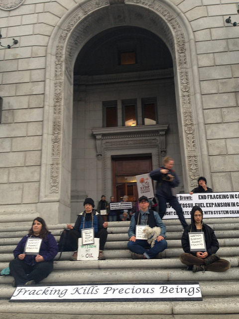 About 70 activists blockaded the entrance to the California State office building in San Francisco on Friday morning in support of a state-wide ban on fracking.