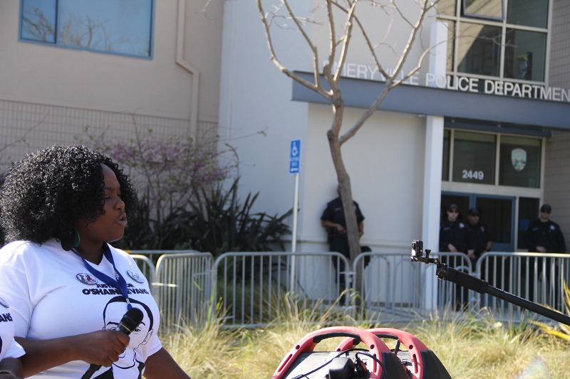 What became a five-hour non-violent civil disobedience shutdown of Home Depot began as a 10am rally at Emeryville police headquarters. Police set up metal barricades in front of their building while three officers stood on the roof to watch demonstration below, one recording video of protesters. Family members who have lost loved ones to police violence spoke, including the brother of Yuvette Henderson. Still distraught from the killing of his sister not three weeks earlier, he said that Emeryville authorities have expressed no sympathy to Yuvette’s family.