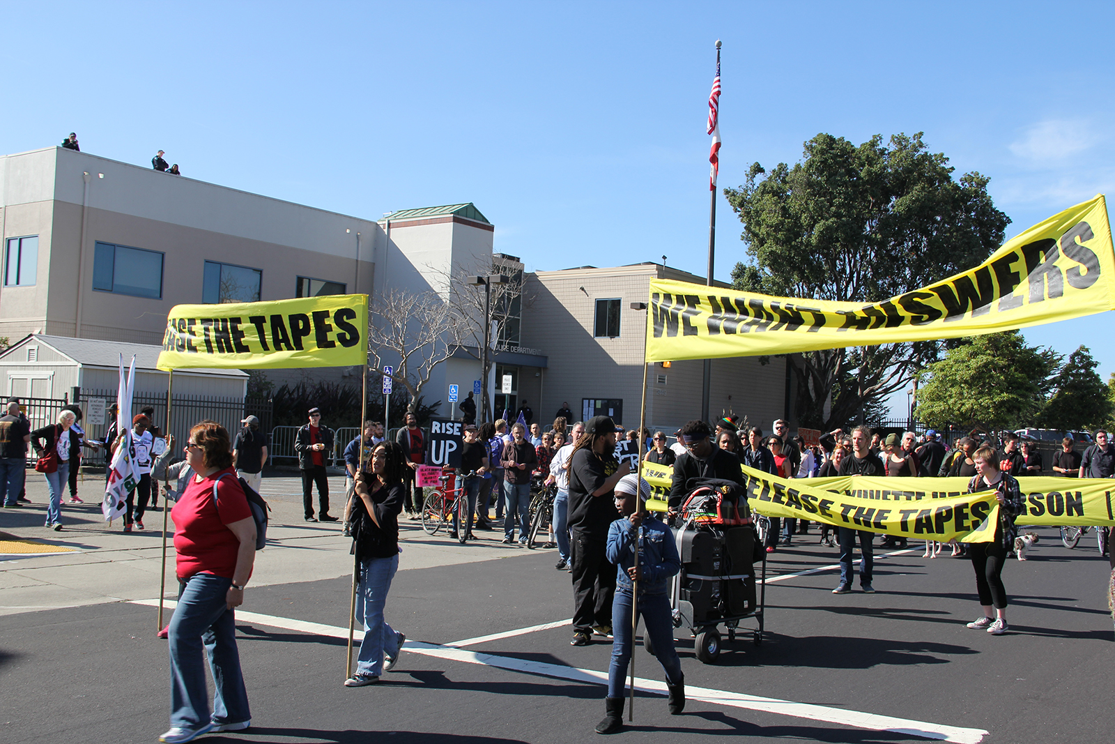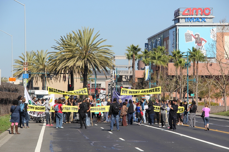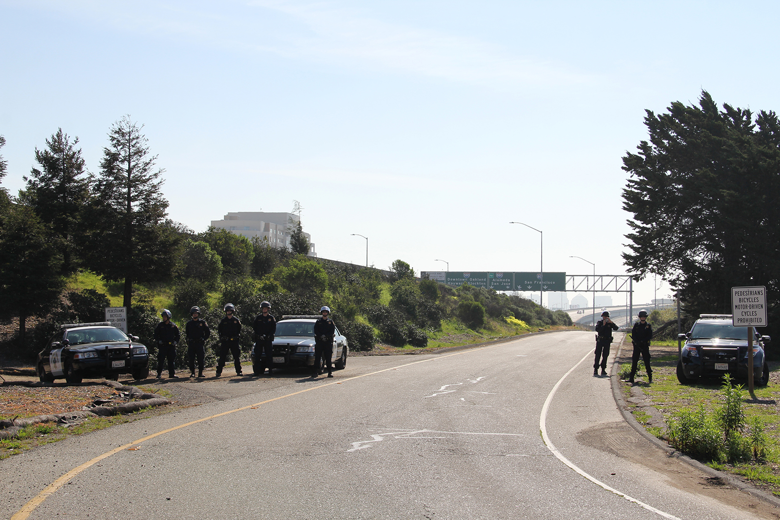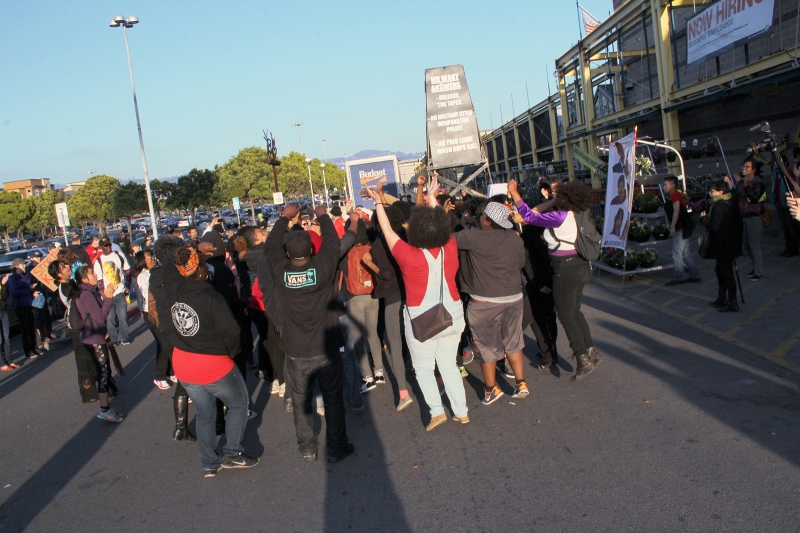 By 11am, the hundred or so demonstrators gathered at police headquarters began to march with signs and a mobile sound system. During the nearly 50-minute march to a destination that was not publicly announced, California Highway Patrol officers with riot helmets assembled at what they thought might be potential targets for the march, primarily freeway on ramps. CHP motorcycles attempted to stay ahead of the march. Numerous marked and unmarked Emeryville police vehicles paced the march, blocking opposing automobile traffic as the march progressed down Powell and Shellmound Streets past the Bay Street shopping area.